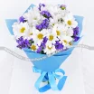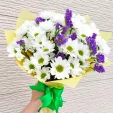 хризантема белая кустовая ромашковая - 7 ., статица - 3 шт., салал, фетр фиолетовый. Примерный размер: 25Х30 см. Данный букет представлен на фото
